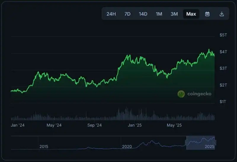 这些事件推动了加密货币总市值突破4.18万亿美元,较数月前约2.5万亿美元的记录显著提升。简单来说,加密资产重获关注,再度吸引了资深投资者与新晋投资者的兴趣。