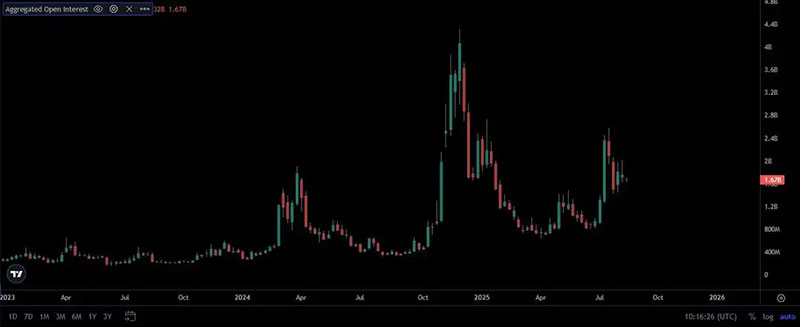 DOGE 仍然在每个主要交易所上市,包括 Binance、Coinbase 和 OKX,且拥有深度订单簿和活跃的现货交易。在衍生品方面,未平仓合约最近徘徊在 33 亿美元左右,并在 2025 年 8 月中旬飙升至 37 亿美元以上。这证实了尽管价格停滞不前,交易者仍在继续大规模投机狗狗币。