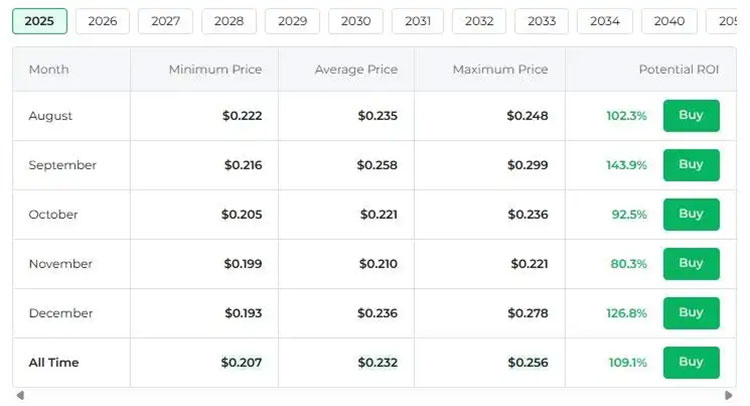 - WalletInvestor:预测高点为0.38美元,假设存在如利率下降等积极的宏观因素。